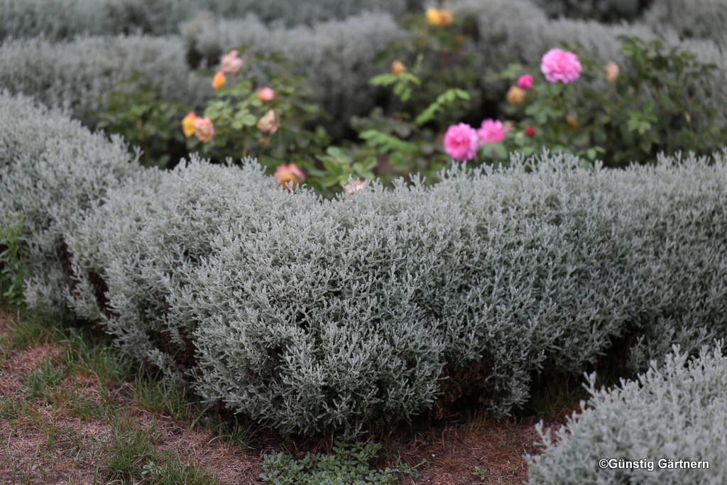 Statt mit Buchs sind die Beete im formalen Teil mit Heiligenkraut und Eiben eingefasst - eine exzellente Wahl:
